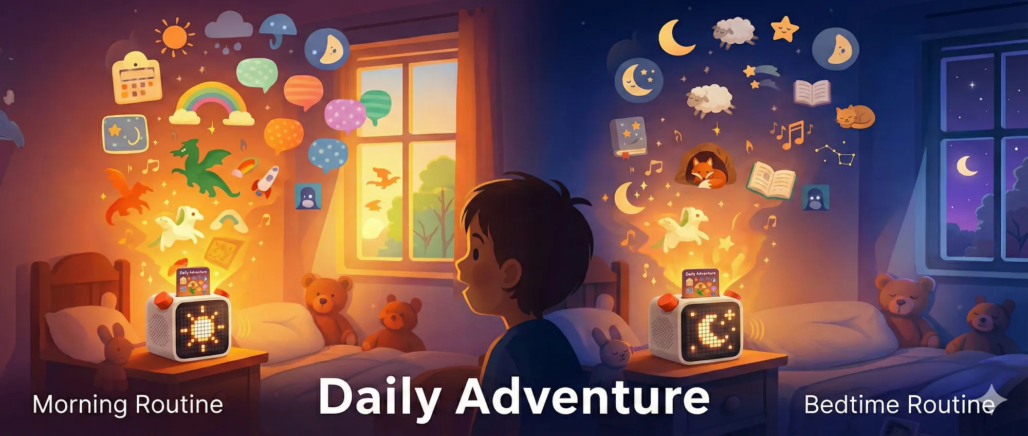 That's why I built Daily Adventure. It turns your Yoto player into an alarm clock that doesn't just beep - it tells your child about their day through story.