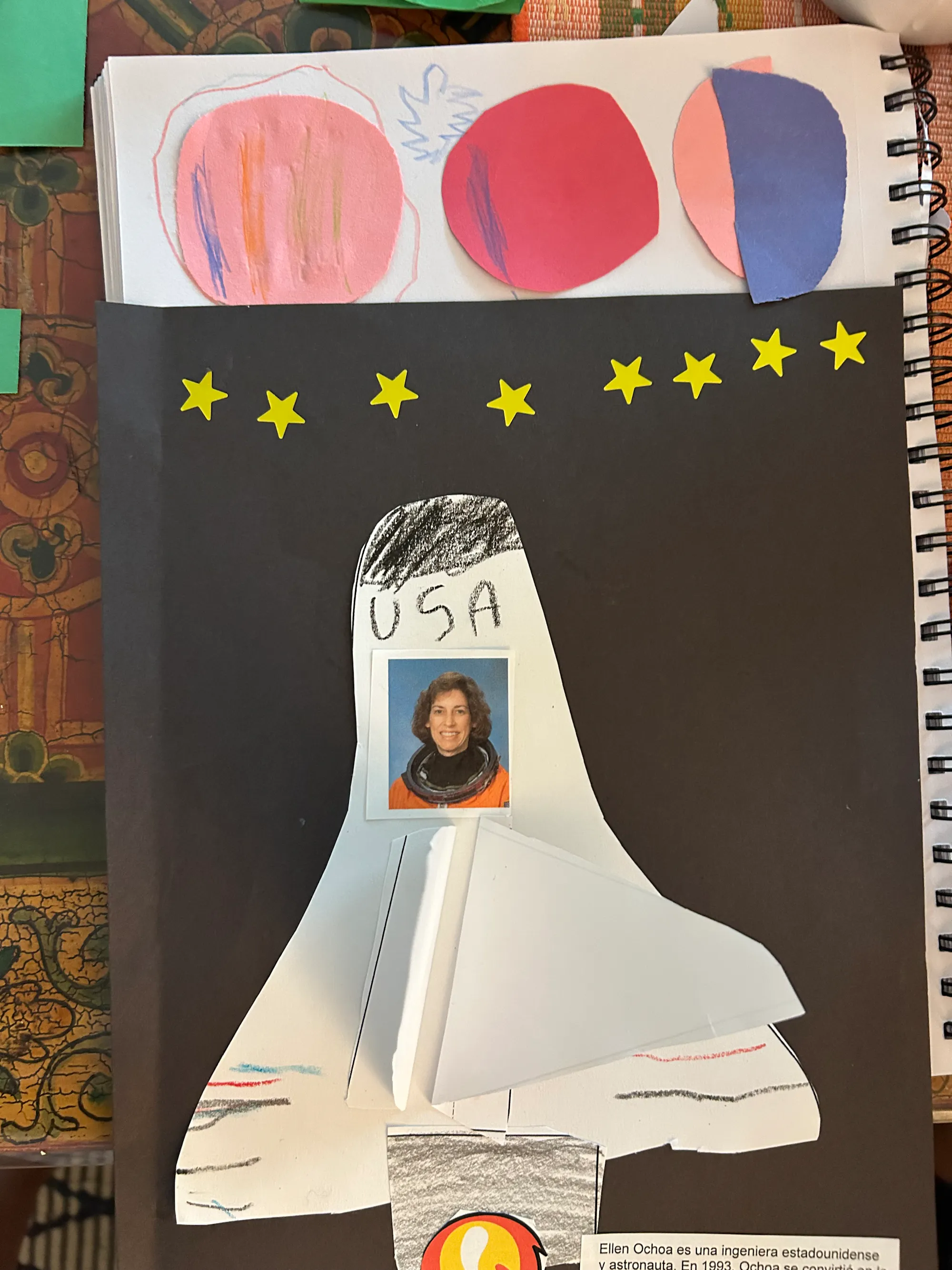 I made planets and I added a collage from school. We learned that Ellen Ochoa was the first Spanish-speaking woman to go to space.
