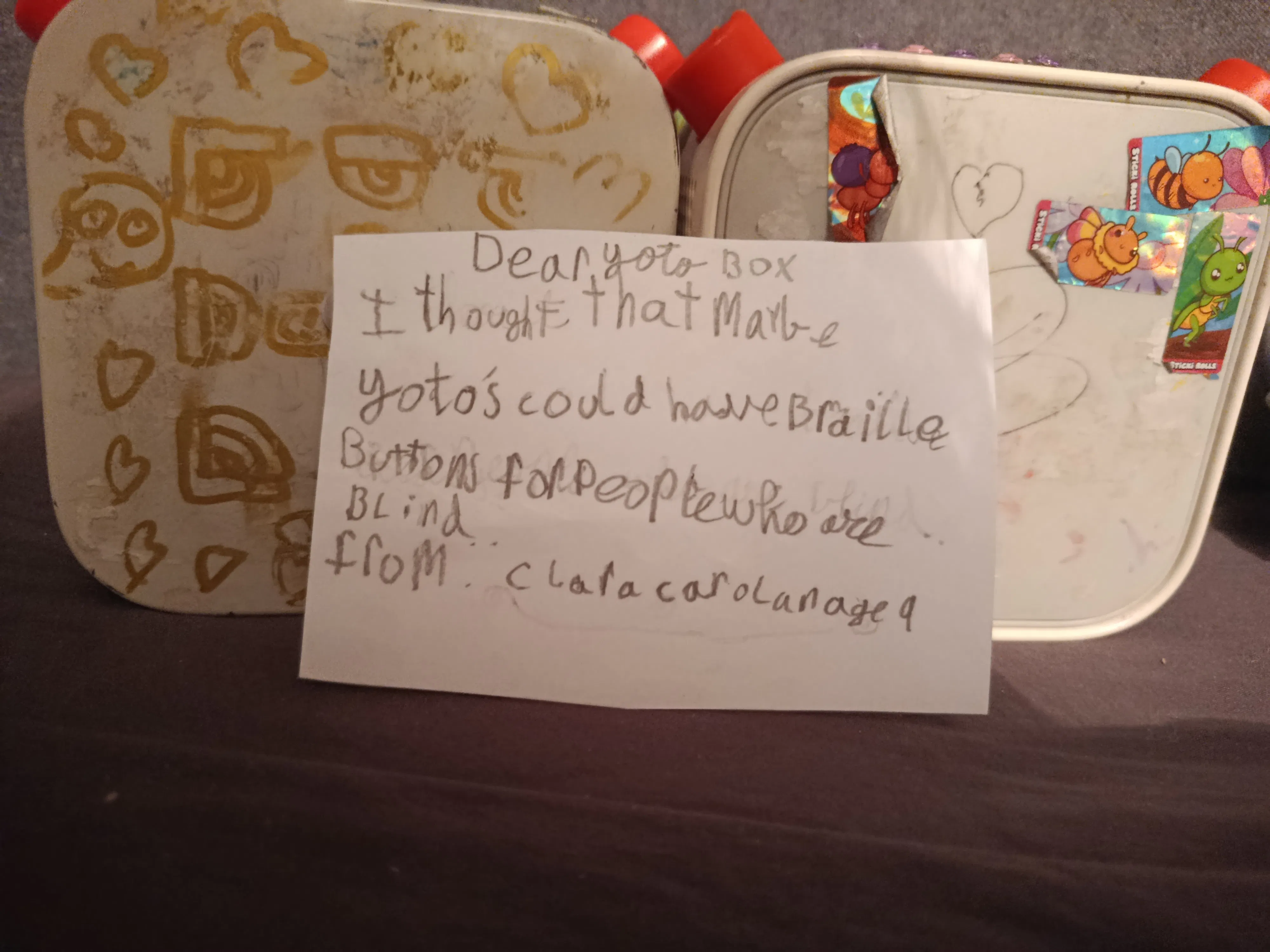 Hi, my name is Clara. I learned about Braille at school. I thought that maybe you could put Braille on the buttons to help visually impaired people. Love, Clara, age 9. Xx