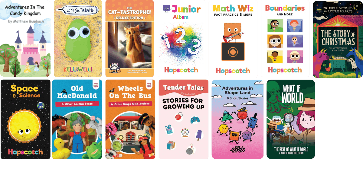 Hopscotch Collection featuring songs about Social and Emotional Learning, reading, colors, and instruments of the orchestra.